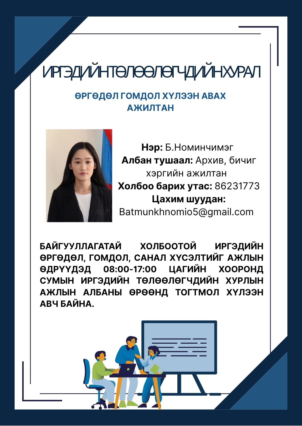 БАЙГУУЛЛАГАТАЙ ХОЛБООТОЙ ИРГЭДИЙН ӨРГӨДӨЛ, ГОМДОЛ, САНАЛ ХҮСЭЛТИЙГ АЖЛЫН ӨДРҮҮДЭД 08:00-17:00 ЦАГИЙН ХООРОНД СУМЫН ИРГЭДИЙН ТӨЛӨӨЛӨГЧДИЙН ХУРЛЫН АЖЛЫН АЛБАНЫ ӨРӨӨНД ТОГТМОЛ ХҮЛЭЭН АВЧ БАЙНА.